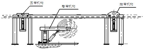2、 啟動(dòng)拉緊機構進(jìn)行松繩,拉緊小車(chē)同時(shí)送開(kāi)皮帶。開(kāi)啟抽帶機構的液壓馬達驅動(dòng)固定輥,使其順時(shí)針旋轉,通過(guò)固定輥和活動(dòng)輥的摩擦力將皮帶滾出,使皮帶在壓帶機構和抽帶機構之間縮曲,用剪刀剪斷,將皮帶斷頭安裝在卷帶機上。