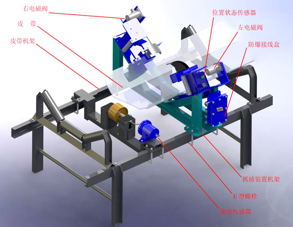 主要特點(diǎn): 該產(chǎn)品為機電一體化智能型產(chǎn)品,可根據用戶(hù)皮帶機的實(shí)際運行狀況,通過(guò)控制主機(PLC)進(jìn)行編程,滿(mǎn)足用戶(hù)要求,在皮帶安全下滑距離內,不對皮帶進(jìn)行抓捕。 控制主機選用西門(mén)子可編程控制器(PLC),可實(shí)現與中控室通訊,與礦山智慧物聯(lián)網(wǎng)系統組網(wǎng),實(shí)時(shí)監控皮帶機的工作狀態(tài)。 通過(guò)控制程序實(shí)現自動(dòng)分析皮帶是蠕動(dòng)下滑倒帶還是斷帶的功能;具有故障顯示查詢(xún)、聲光報警功能,可采用多種操作模式。 抓捕皮帶的執行機構為一組左、右對稱(chēng)的敞開(kāi)式凸輪壓帶方式,體積小,結構緊湊。抓捕皮帶的夾緊力隨著(zhù)皮帶下滑位移的增大而增加。 該執行機構的凸輪壓帶部分為高分子復合材料一次注塑成形,具有強度大、韌性好、重量輕等特點(diǎn),能保證在抓捕皮帶時(shí)與皮帶緊密接觸,防止打滑,不損傷皮帶。 采用沿線(xiàn)多點(diǎn)布置,當速度傳感器檢測到皮帶運行異常(斷帶、倒帶)時(shí),沿途布置的所有斷帶抓捕裝置同時(shí)動(dòng)作,抓捕指令準確無(wú)誤,抓捕動(dòng)作一致,可靠。 該產(chǎn)品具有人工試驗功能,可隨時(shí)在現場(chǎng)進(jìn)行抓捕動(dòng)作試驗。 獨有的位置狀態(tài)傳感器可實(shí)時(shí)檢測斷帶抓捕裝置的工作狀態(tài)。