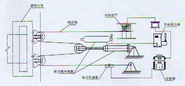 本裝置主要由基座、張緊絞車(chē)、液壓張力緩沖裝置、控制箱和張力傳感器五部分組成。圖示中的鋼絲繩由用戶(hù)提供,游動(dòng)小車(chē)是皮帶機部件。張緊動(dòng)作可根據需要實(shí)現變頻控制。 該型號張緊裝置結構簡(jiǎn)單、經(jīng)濟可靠、為免維護型張緊裝置?捎迷诓擅汗ぷ髅。